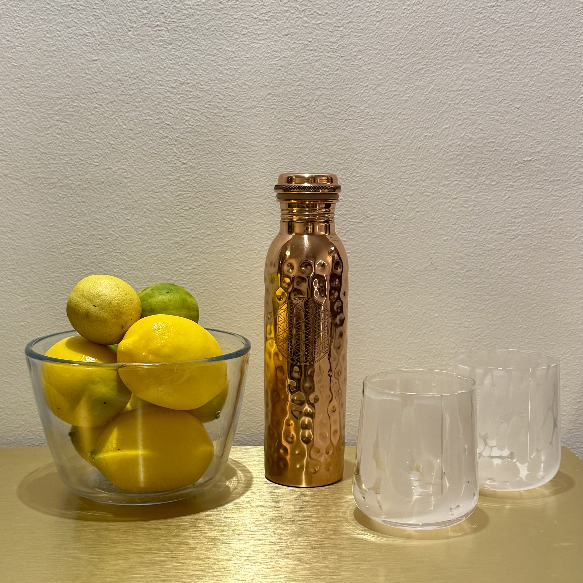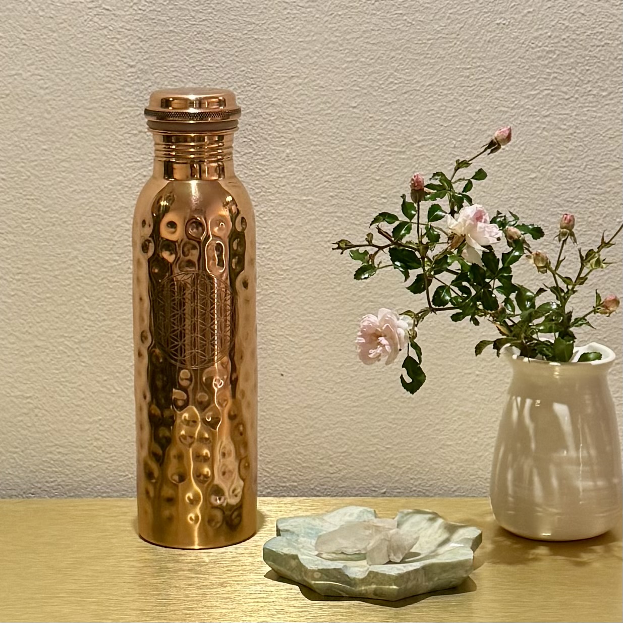 Diese handgehämmerte Kupferflasche mit eingravierter Blume des Lebens ist ein ganz besonders wertvoller Schatz für alle, die es lieben, reines und energetisch hochwertiges Wasser zu jeder Zeit zu trinken.